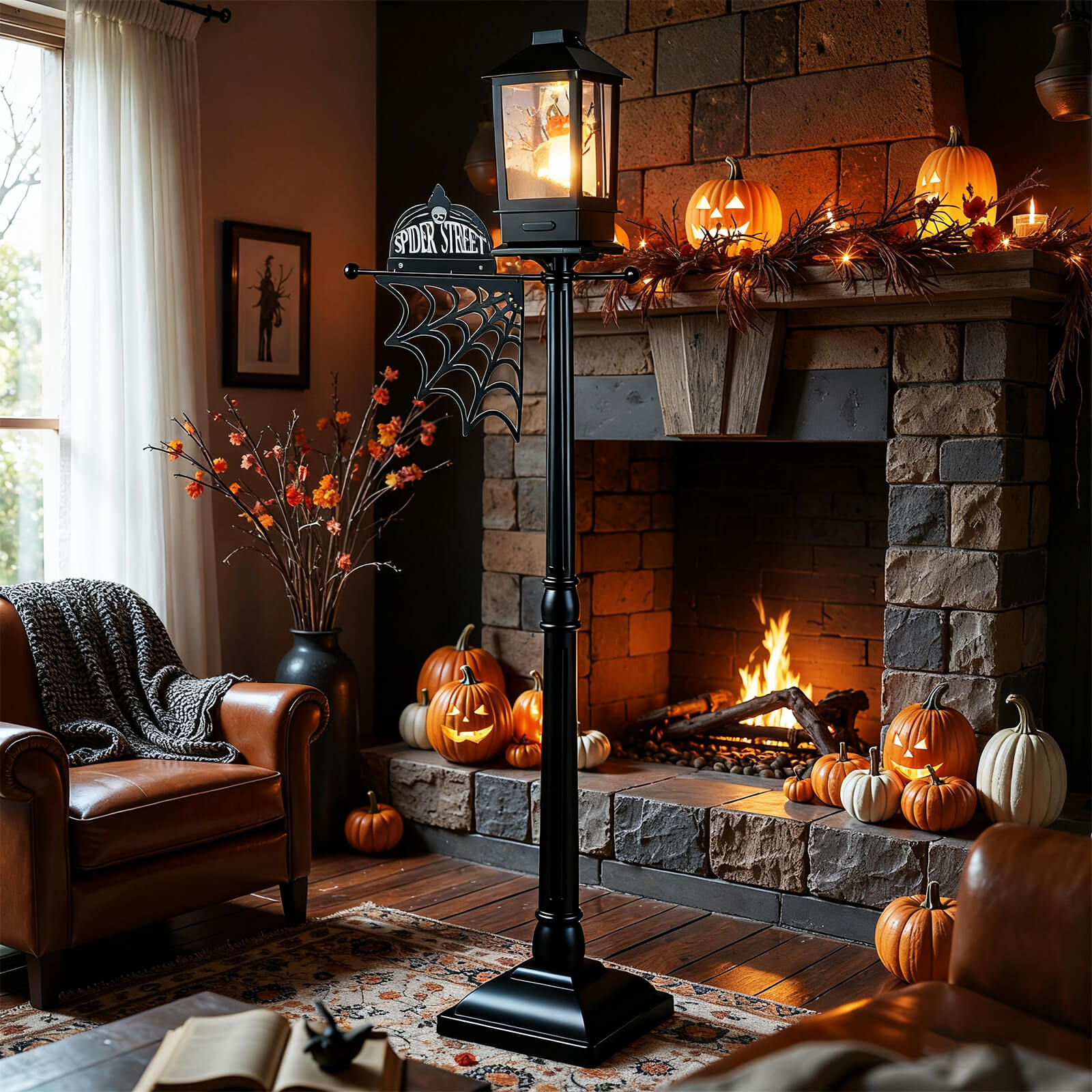 This 155 cm Halloween lamp post features sound-activation that brings it to life with eerie music and a mesmerizing black snowy effect. It's illuminated by LED lights with 6 colors, creating a dynamic and atmospheric glow that enhances any space. In addition, this street lamp is adorned with classic Halloween symbols including a pumpkin ghost and spider web, each adding to the creepy charm of the piece. With a detachable design, this lamp post can be transformed for tabletop display, making it a versatile choice for decorating both dining areas, mantles, or windowsills. If you are looking for such a product, do not hesitate to buy it! Sound Activated Streetlamp: This 155 cm Halloween lamp post reacts to sounds with flashing LED lights, eerie music and black snow effects, perfect for creating a mystical ambiance in both home and doorstep. Multi-color LED Lights: This lamp post is designed to light up your space with 6 LED lighting colors that include red, yellow, orange, green, blue and purple. Whether it's for a party or a spooky movie night, this lamp post will create a wonderful Halloween atmosphere. Enchanting Halloween Elements: Adorned with a classic pumpkin ghost and spider webs, this indoor decorative streetlamp brings the traditional Halloween elements to your celebration. The stable base ensures a secure placement on any flat surfaces. Detachable & Versatile Design: This Halloween lamp post isn't just for the floor; it features a detachable design that allows you to transform it into a tabletop decoration or use its integrated hanging ring for elevated eerie effects. Hassle-free Setup: This battery powered Halloween lamp post is easy to assemble and use. First, install the base, then connect the poles, install the spider web and the lantern, and finally insert 3 AA batteries (not included) and turn on the switch.