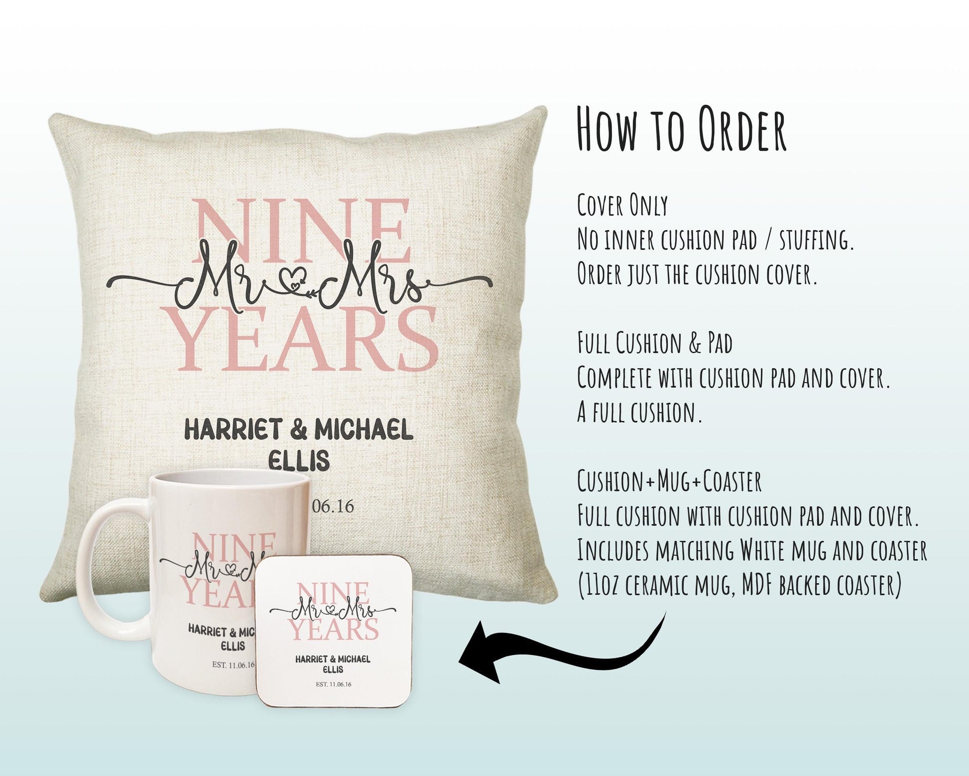 9th Wedding Anniversary Gift for Him for Her - Ninth Cotton Anniversary Gift Cushion Personalised with Names Date Mr and Mrs Married BNJ09C