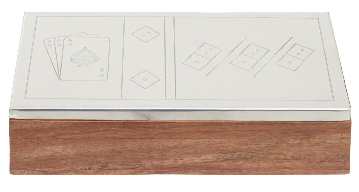 The warm wood tones of the box and the cool silver accent create a balanced, contemporary look that sits comfortably on sideboards, shelves, and coffee tables.