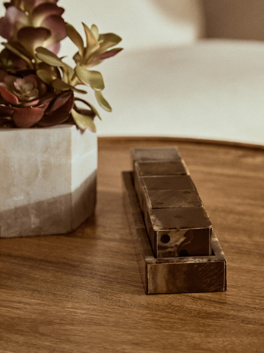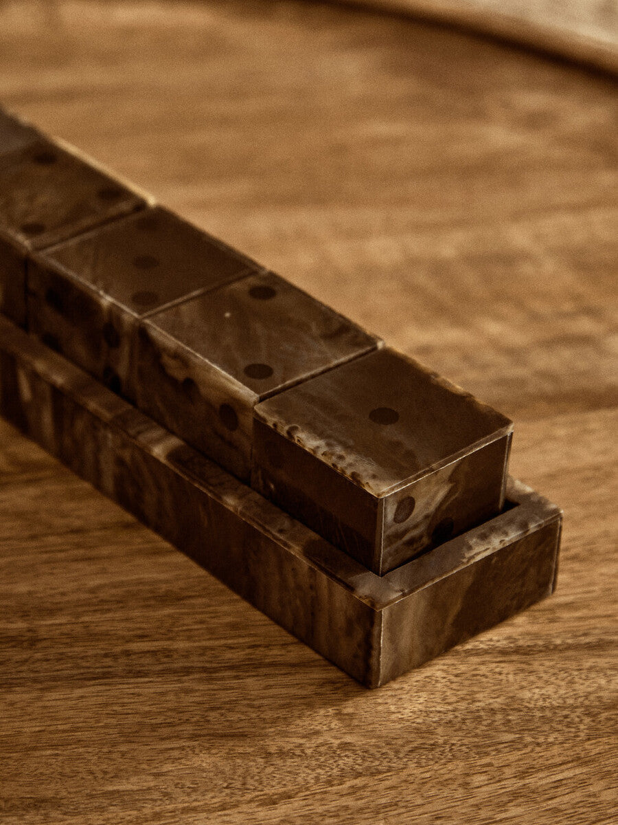 Made from premium resin, each die combines rich brown and deep black shades, delivering both durability and style. The set comes with a rectangular tray with raised edges, keeping the dice neatly stored when not in use.
