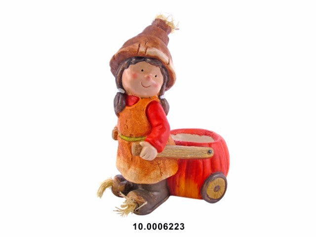 | DEC. TEMATICA -MENINA C/CARRO ABOBORA COR LARANJA 28X18X40CM |