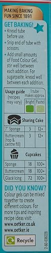 Details: Description Product Description Dr. Oetker Extra Strong Green Food Colour Gel delivers strong, bright colours that keep their colour during baking. Food colour gels are a great alternative to colouring liquids, and work great when colouring fondant icing or making a sugar paste. Developed in a large tub, with higher concentrate, the Dr. Oetker colour gels give you long lasting results. The easy-to-use colours can be used one drop at a time to create pastel shades, or go out with a bang and create the boldest rainbow cake ever! Why not use our Green Food Colouring for creating a green piping icing for grass and leaves? For recipes and inspiration, head to our website. Alternatively, follow us on Facebook - Dr. Oetker Baking - for tips and tricks direct to your news feed. Ingredients Glucose Syrup, Colouring Foods (Concentrates from Safflower, Lemon), Sugar, Water, Gelling Agent (Carrageenan), Acidity Regulators (Lactic Acid, Acetic Acid, Sodium Lactate), Preservative (Potassium Sorbate), Colour (Brilliant Blue FCF (E 133)) Directions Store in a cool dry place. Always use the amount stated within the recipe being followed. Safety Warning Not suitable for children under 36 months – choking hazard. Manufacturer Contact Information 4600 Park Approach Thorpe Park, Leeds LS15 8GB