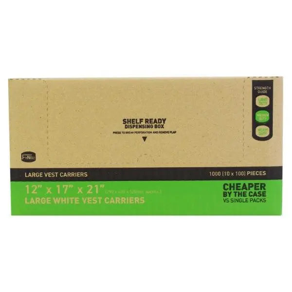 Experience convenience and efficiency with FyNite 100 Pieces Large White Vest Carriers. With a spacious size of 12" x 17" x 21", easily carry your items in bulk. These sturdy and reliable bags make shopping a breeze. Say goodbye to flimsy bags and hello to a stress-free shopping experience!