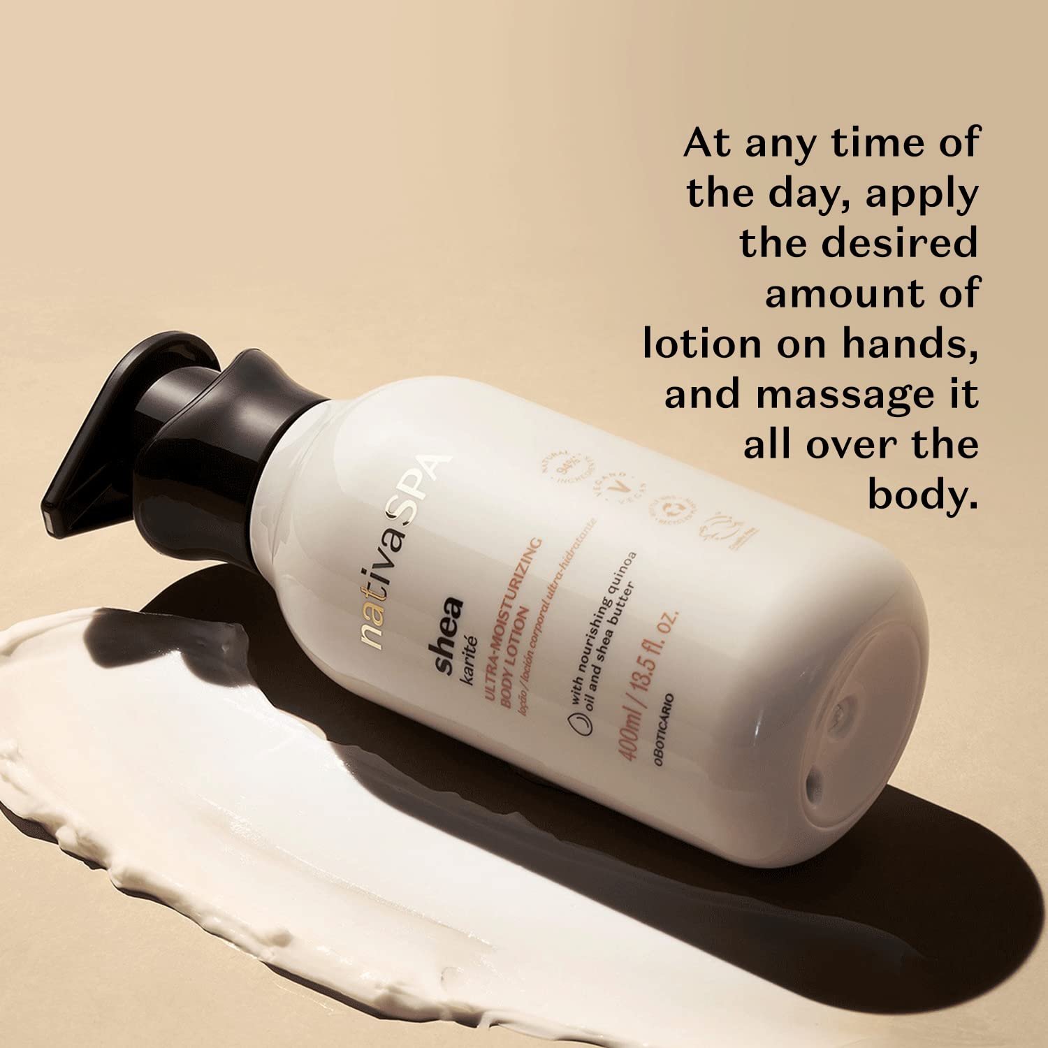 Details: Description A skin full of life is what brings Nativa Spa's Shea Moisturizing Body Deodorant. The new formula of this body lotion features the moisturizing power of 100% pure oil from drops of purified quinoa, which also helps to leave skin soft and rejuvenated. And to intensify the aroma in the body, it contains fragrance microcapsules that break throughout the day, bringing moments of surprise, high durability and transmitting energy and joy of living. Its pump container is practical and facilitates the application of the product without waste. 400 ml