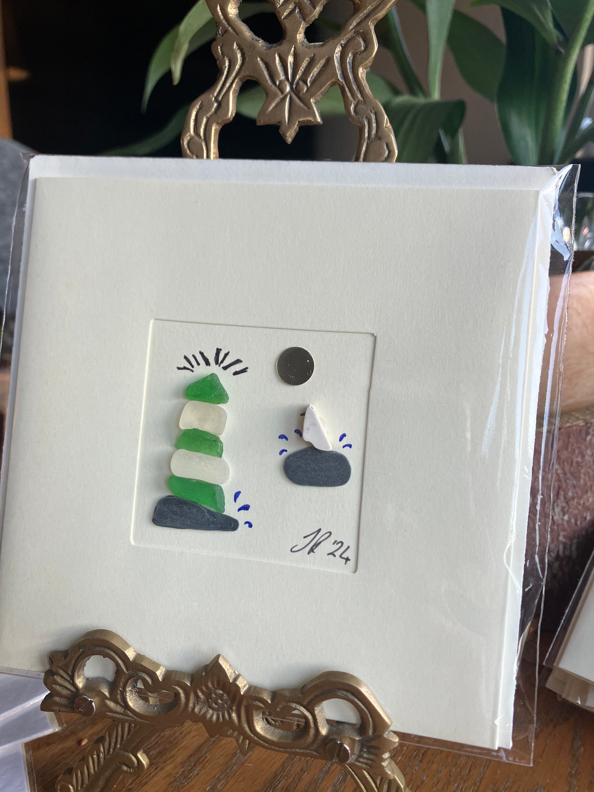 Hand-crafted cards each with a unique a design and perfect for any occasion. The intricate details showcase the seaglass and are all unique. Can be framed please request framing fur an additional £20, all frames are black.