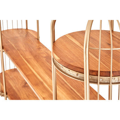 The Mantis Champagne Gold Finish Birdcage Shelf Unit by Orsina turns storage into display. Orsina joins two elegant birdcage forms with long wooden shelves, pairing a champagne gold iron frame with warm natural timber.