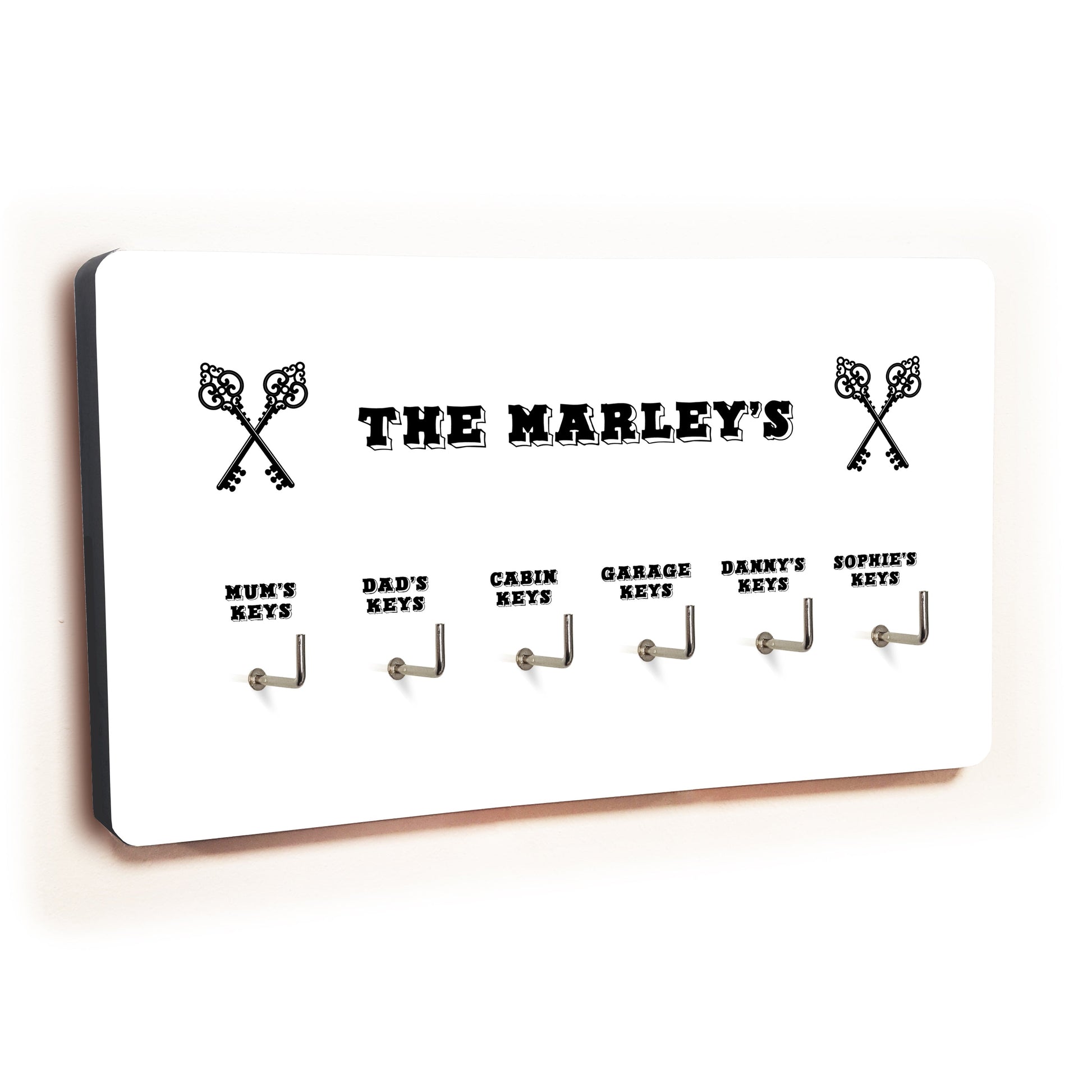 Personalise this white 6 hook key hanger with cross key design by adding a title, such as you family name and what is to be hung on each hook.