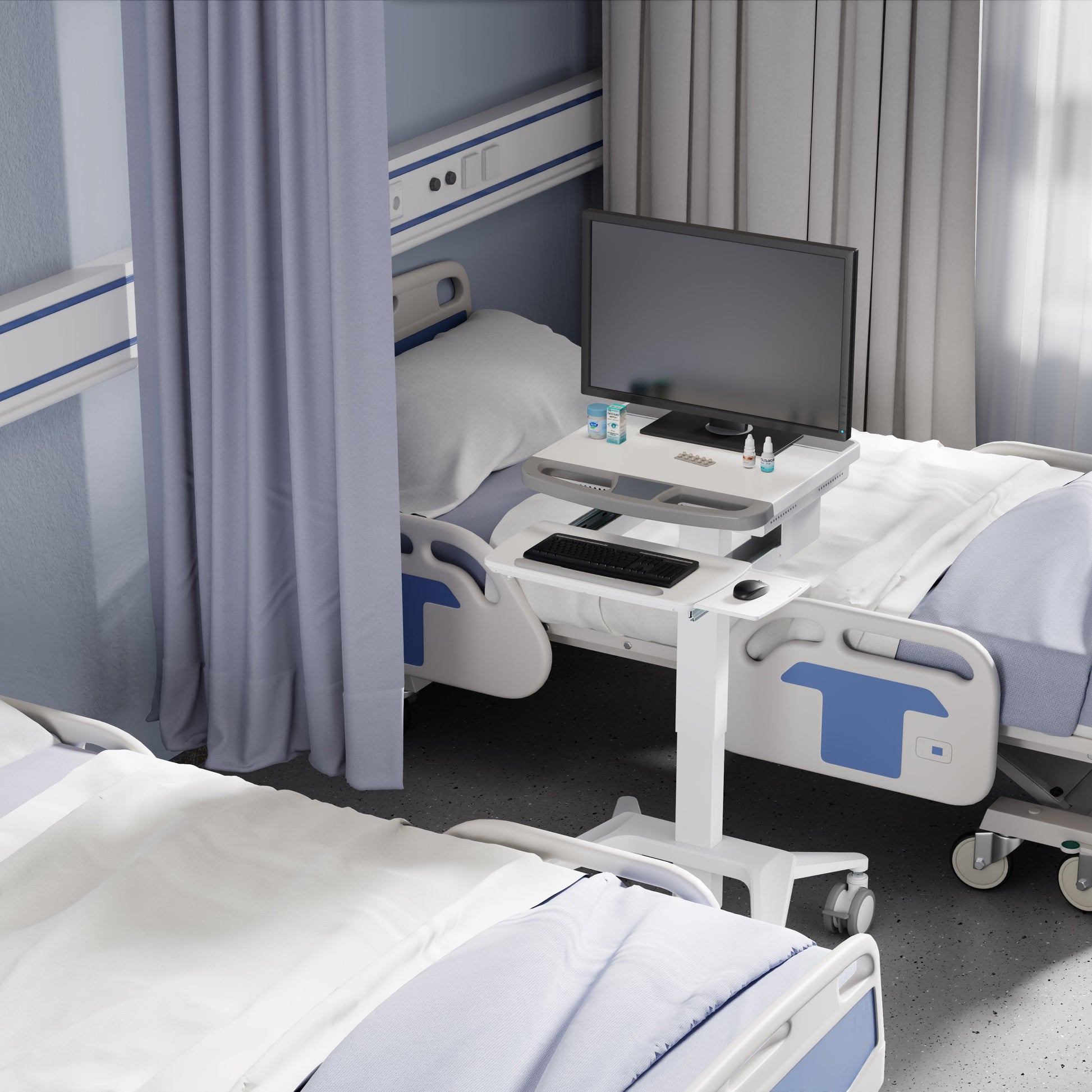 The pneumatic foot-pedal lift system allows smooth height adjustment between 800mm and 1150mm, enabling effortless transitions between sitting and standing positions. Four locking caster wheels offer maximum mobility when moving between rooms and stability when stationary, making it ideal for multi-user or shift-based environments. The keyboard tray is included with a retractable mouse tray for easy typing.