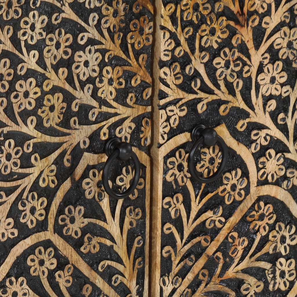 This side cabinet, featuring a timeless look, is meant to be an excellent addition to your home. Solid mango wood: Solid mango wood is a strong, tropical hardwood that makes sturdy furniture. Its beautiful wood grains make every piece of furniture slightly different from the next. Made of solid mango wood, the cabinet is durable and stable.Ample storage space: The cupboard offers ample storage space for keeping your various daily essentials well-organised and within easy reach.Displaying function: The top of the storage cabinet is great for displaying your decorative items, photo albums or small plants.Sturdy legs: The iron legs add the side board's sturdiness and stability.Retro style: This home organiser with hand-carved floral patterns brings the luxury of retro style to your interior, being the focal point of your room. Good to know:Each item is unique with variations in colours and grains. The delivery is random, ensuring the exclusivity and individuality of your product. Warning:To prevent it from tipping over, this product must be used with the provided wall attachment device.